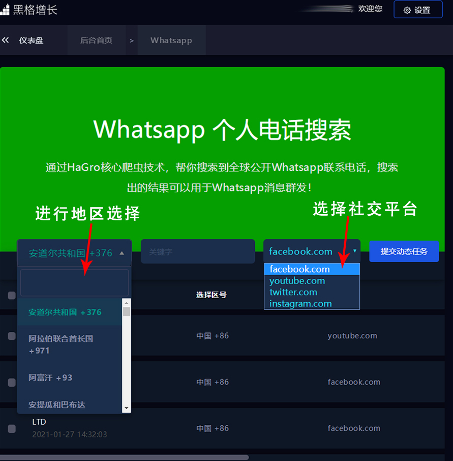 选择HaGro【黑格增长】的【WhatsApp】功能,这时候可以根据地区进行范围内客户筛选,输入关键词,同时还可以对数据来源进行控制。HaGro【黑格增长】对Facebook、YouTube、Instagram等平台上已公开的电话号码进行挖掘。