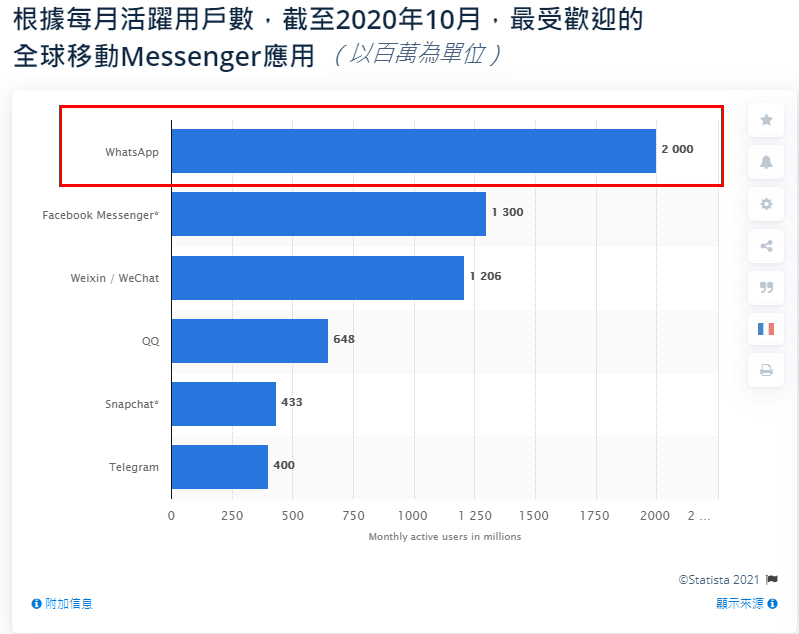 据2020年的数据统计,WhatsApp在全球180个国家/地区里有超过20亿活跃用户,每天有10亿人使用WhatsApp,650亿条消息通过WhatsApp发送,正是如此,WhatsApp成为世界上最受欢迎的消息传递应用软件。