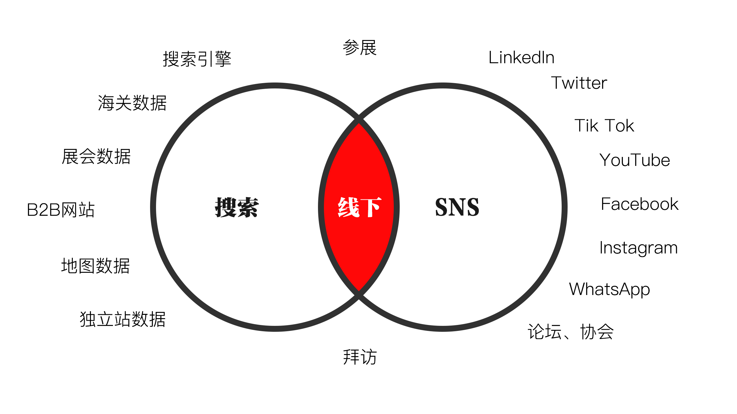 客户的人脉推荐、线下展会交流、搜索引擎搜索、海关数据查询、B2B平台推广、独立站数据、Google图片搜索、利用国外SNS平台等等。