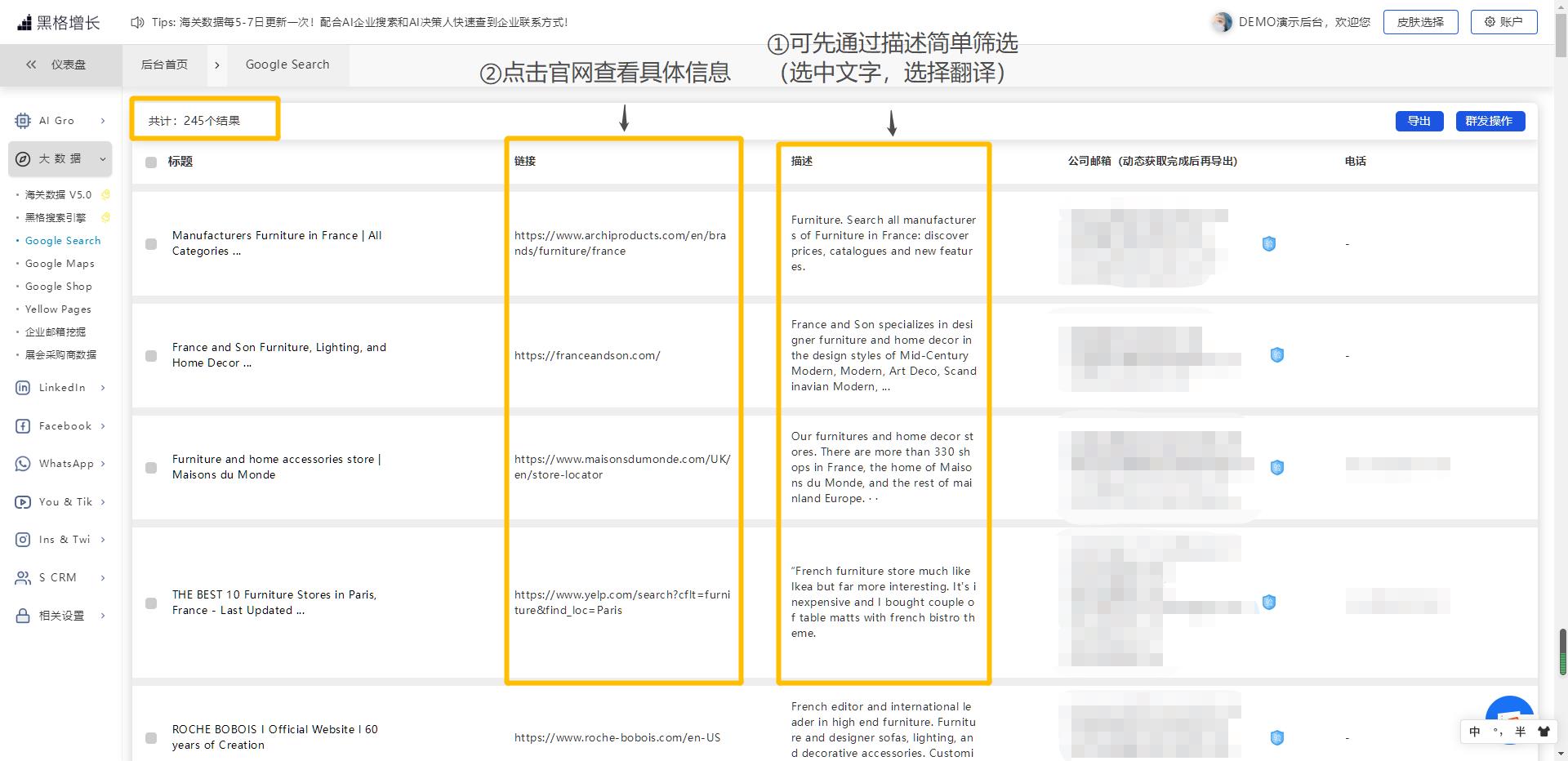 打开黑格Google引擎搜索,输入furniture France,得出245条数据。可以通过“描述”直接筛选合适企业,免去一个个点网站进去查看,耗废时间。