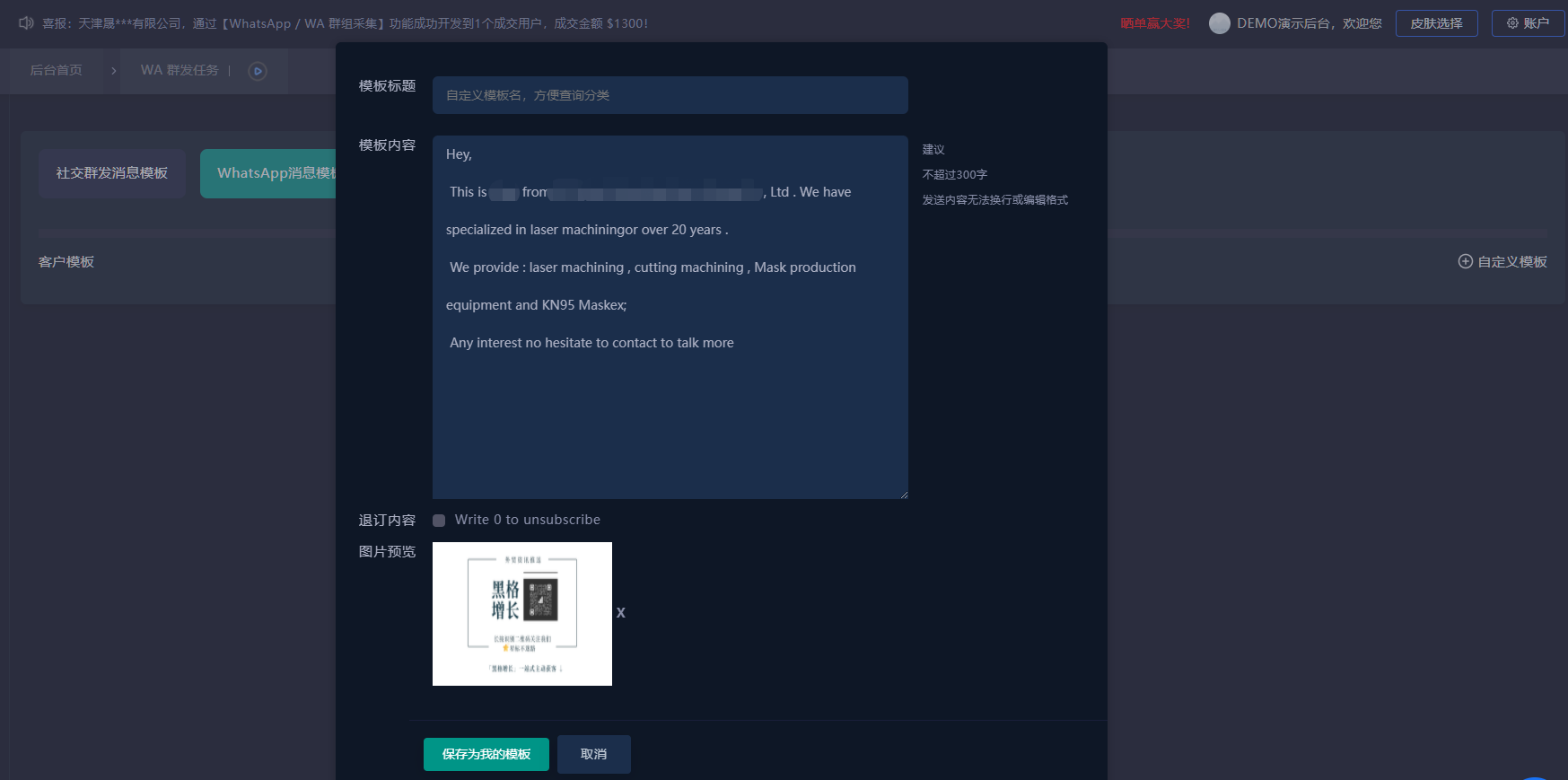 为避免被潜在客户投诉导致WhatsApp账号受冻,在黑格增长群发模板中特意备注了勾选:Write 0 to unsubscribe 。一定程度上能减轻潜客对营销信息的厌烦。