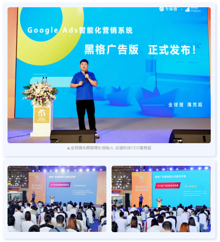 在大会同期举办的私域崛起·独立站峰会上,全球搜&黑格增长创始人、谷道科技CEO蒲竞超向与会嘉宾重磅发布Google广告投放新应用成果——黑格增长Google Ads智能化营销系统。标志着全球搜的业务体系进一步拓展,打通了传统广告投放单线程营销壁垒,赋能企业以数据为依托,形成营销+再营销的闭环营销模式,该系统将有效助力企业提升独立站询盘转化率。