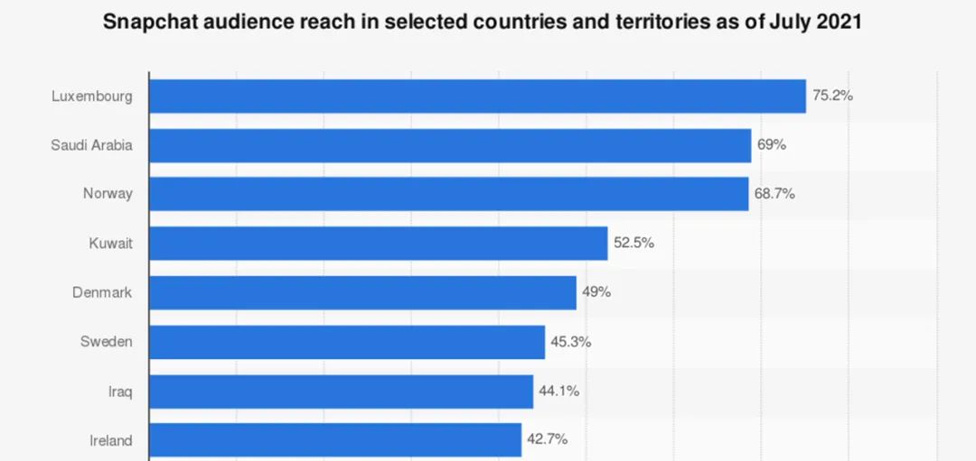 截至2021年7月,从渗透率来说,卢森堡拥有全球最大的Snapchat受众,达到75.2%的人口。沙特阿拉伯以69%的覆盖率排第二,其次是挪威和科威特,分别为68.7%和52.5%。