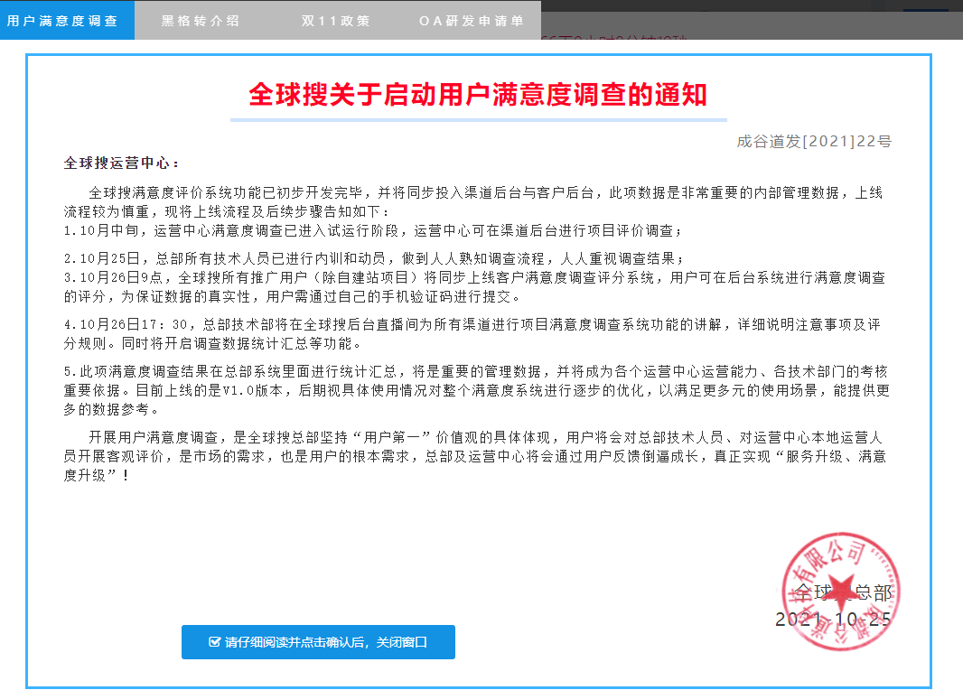 10月25日,全球搜发布了一则关于启动用户满意度调查的通知,如下: