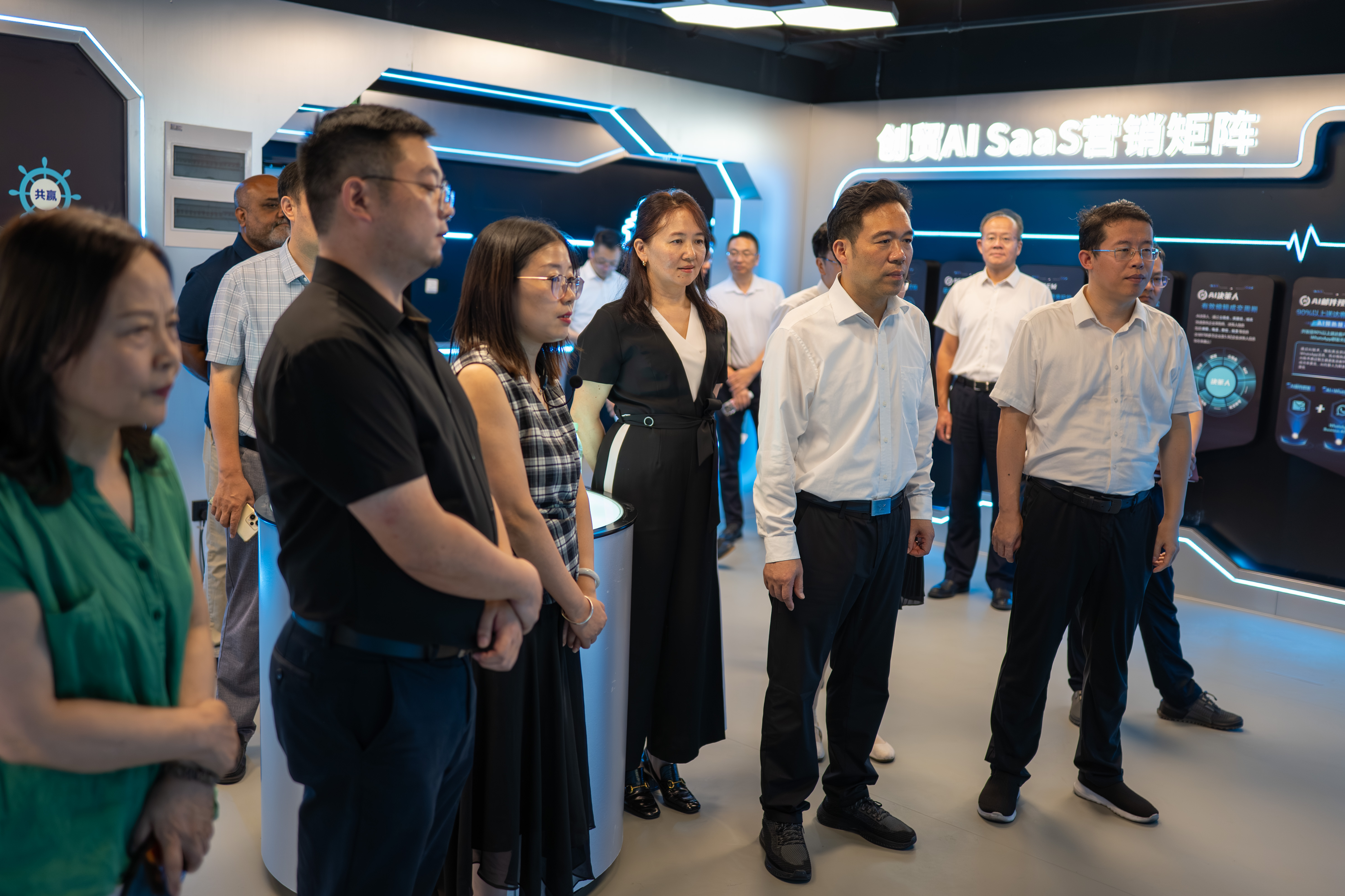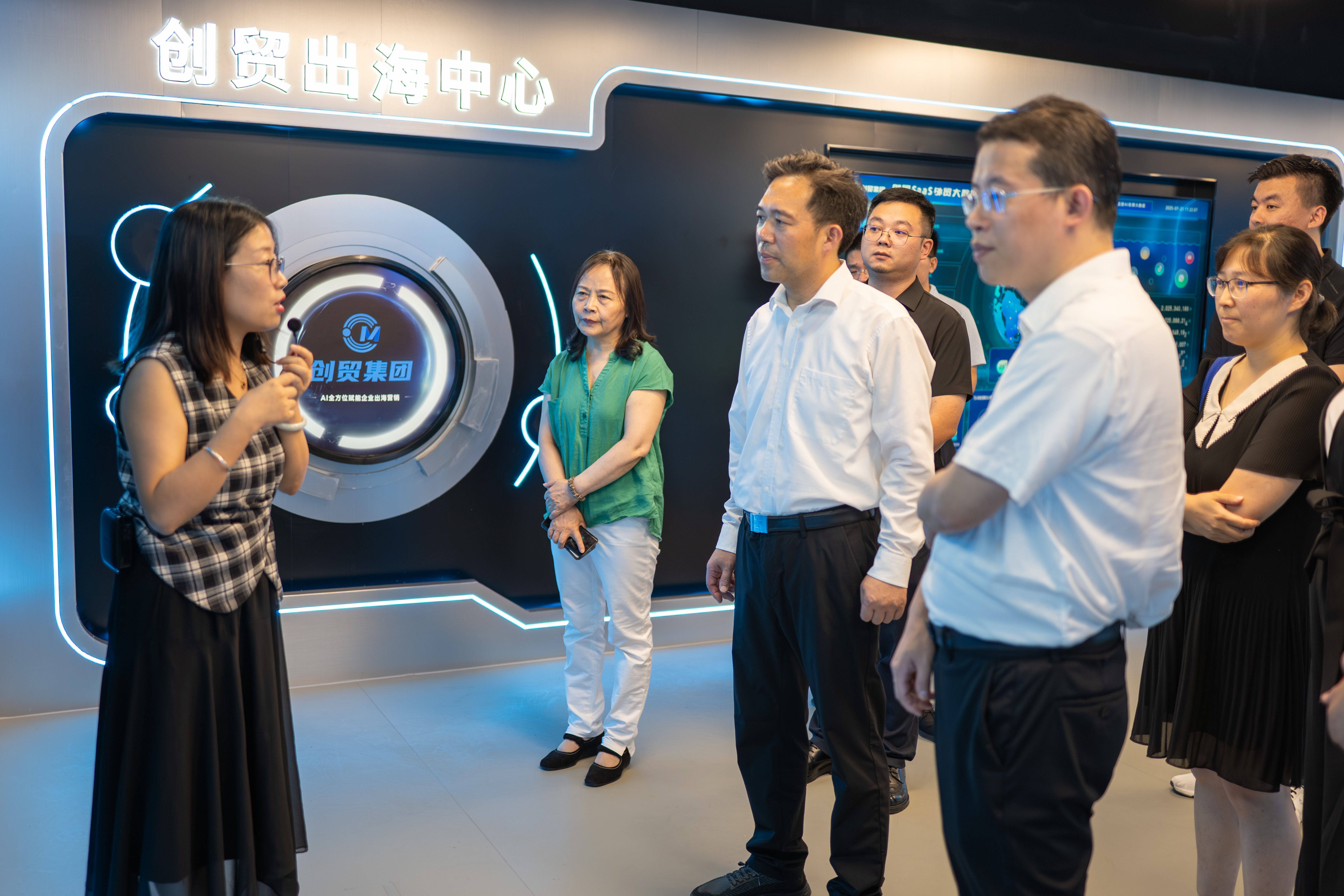 一行领导首先走进创贸出海中心(南通),沉浸式体验了创贸集团最新研发的 AI 技术成果如何为跨境电商企业 “降本增效、拓市突围”。