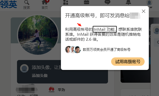 三度人脉:和你共有二度人脉的领英用户,只能通过InMail(高级功能)发消息