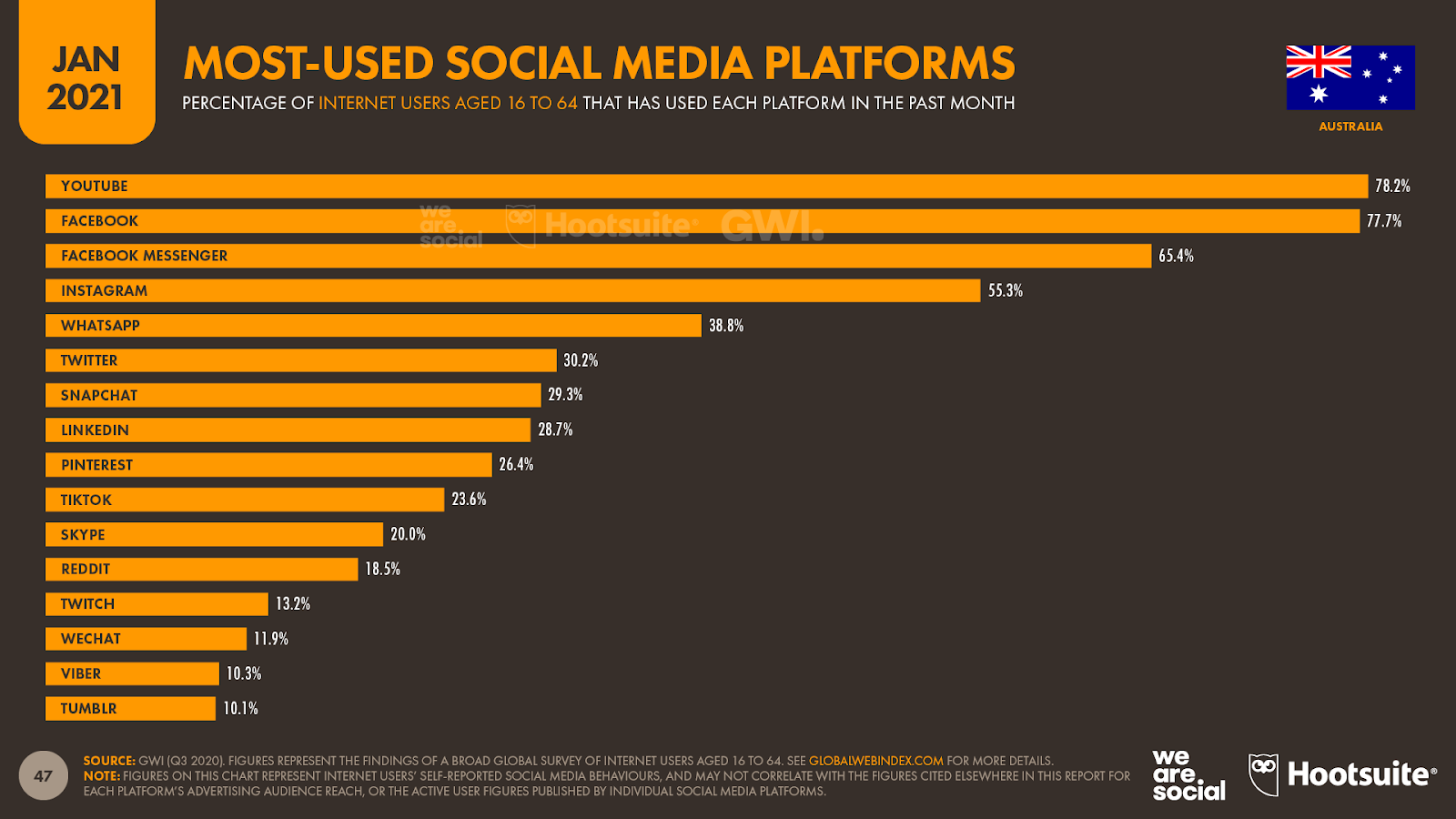 YouTube、Facebook、Facebook Messenger 和 Instagram 仍然是澳大利亚最受16-64 岁互联网用户欢迎的社交平台,但较新的平台正在攀升排名。