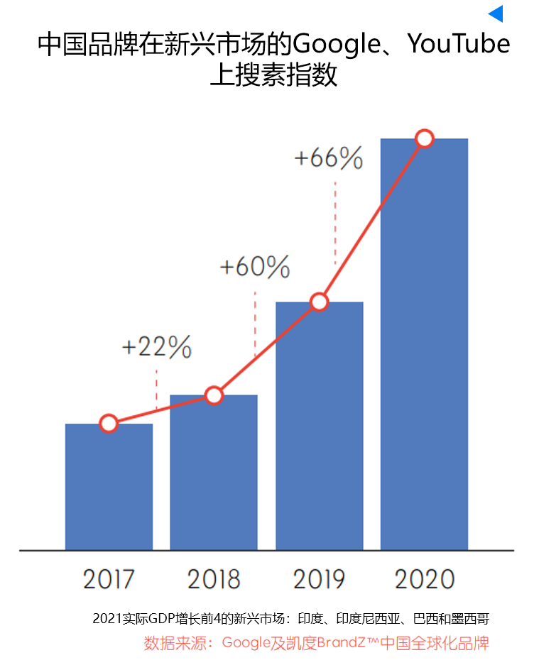 中国品牌在线上的搜索指数日趋上升,Google搜索指数在过去3年增加了14%,YouTube搜索指数则增加了16%,中国50强品牌在新兴市场国家,仅2020年的搜索指数就高达66%!