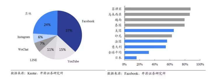 尤其在部分欠发达地区(柬埔寨和缅甸等),Facebook市占率高达62%,占据绝对优势。根据We Are Social 的数据,东南亚各国的Facebook潜在广告触达率在80%左右,远高于世界平均水平(32%)。目前,Facebook 已成为东南亚电商平台最重要的获客渠道之一。