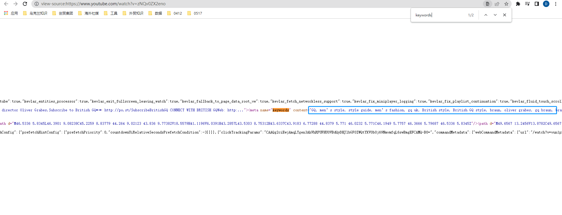 ①你可以查看页面的HTML代码(鼠标右键查看),再搜索页面(Windows 为“ctrl + f”,Mac 为“⌘ + f”),然后输入keywords查看。