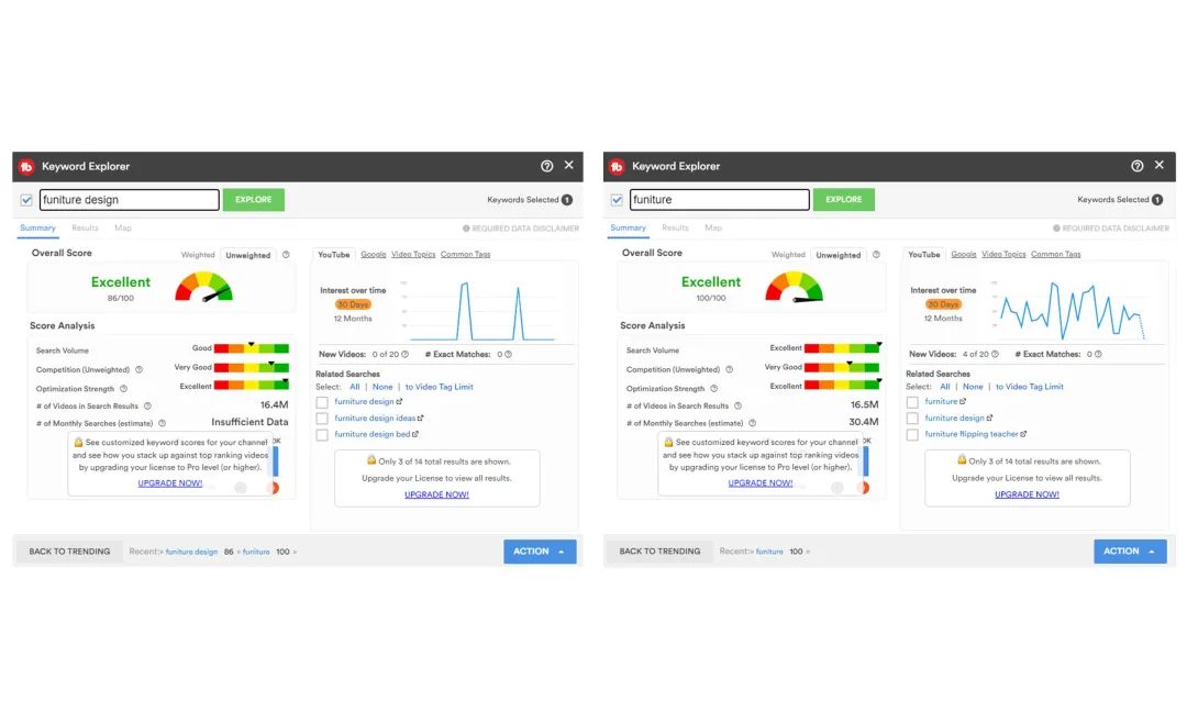 免费下载注册后,它会以插件形式出现在Chrome,然后在YouTube上出现一个图标,可以用来查每一个关键词的搜索情况。