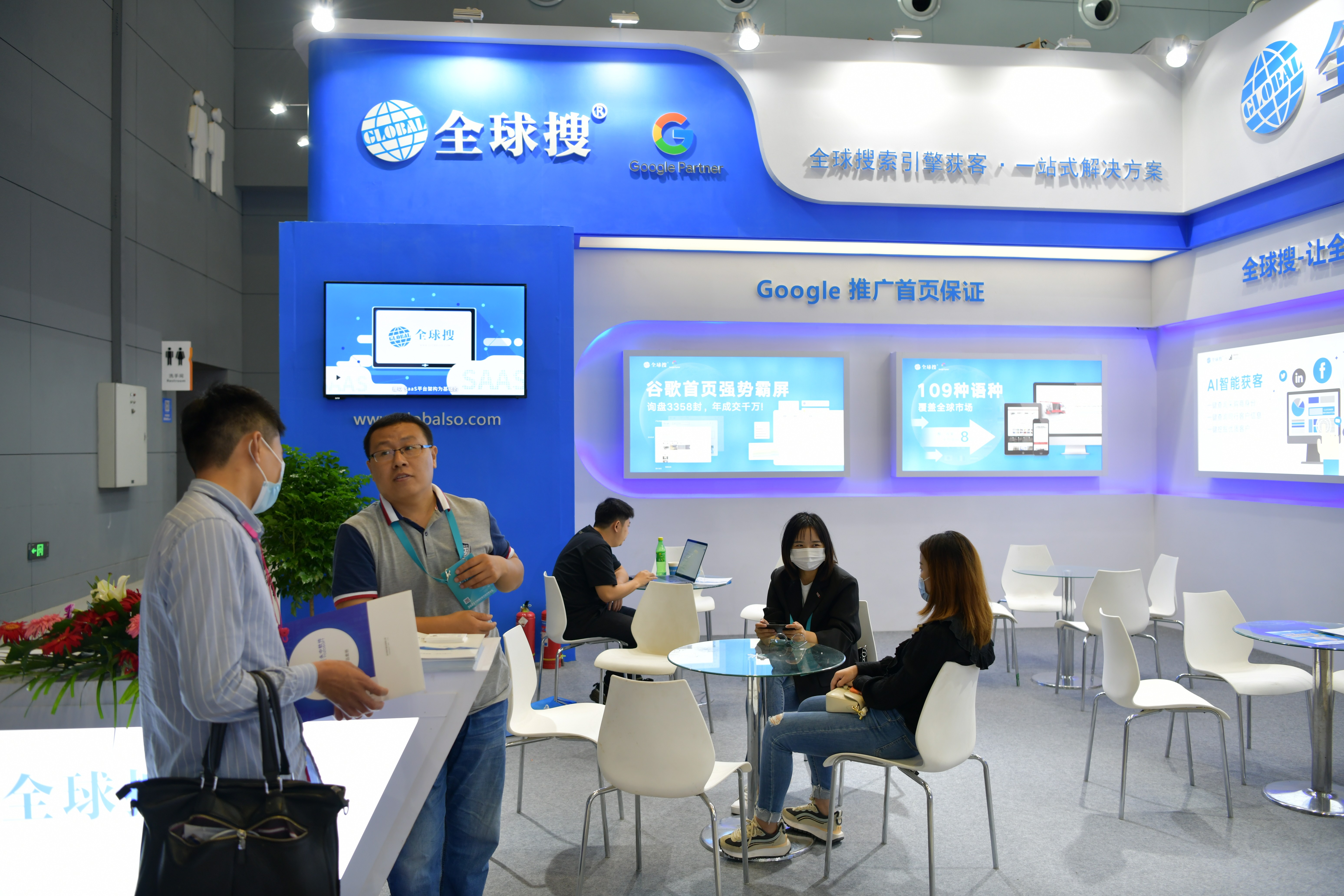 作为数字贸易领域重点参展企业,全球搜展位坐落于会议主馆2号馆E201B号展位,简洁化的设计风格让全球搜的品牌形象快速吸引了众多观众以及参展商的注意。整个展位从Google首页霸屏、109种语言、AI智能获客、有订单独立站四个维度出发,全面展示了全球搜在海外推广方面的技术实力和成功案例,充分体现数字科技驱动外贸经济创新发展的实践和应用成果,激活外贸线上获客新动能。