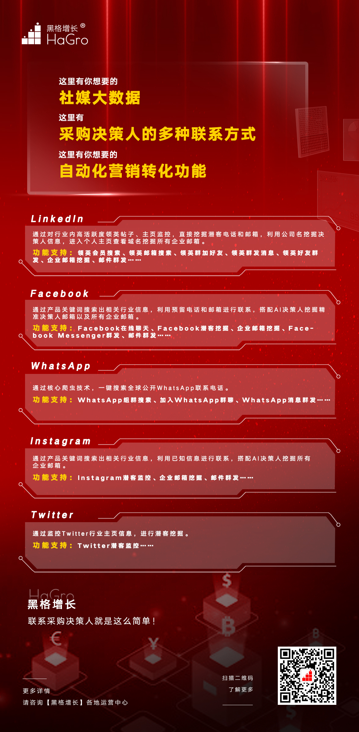 越来越多的海外企业使用Facebook、Instagram、LinkedIn等社交媒体进行企业推广营销,增加企业的曝光,并在社交媒体上挖掘更多商机,开发更多客户。