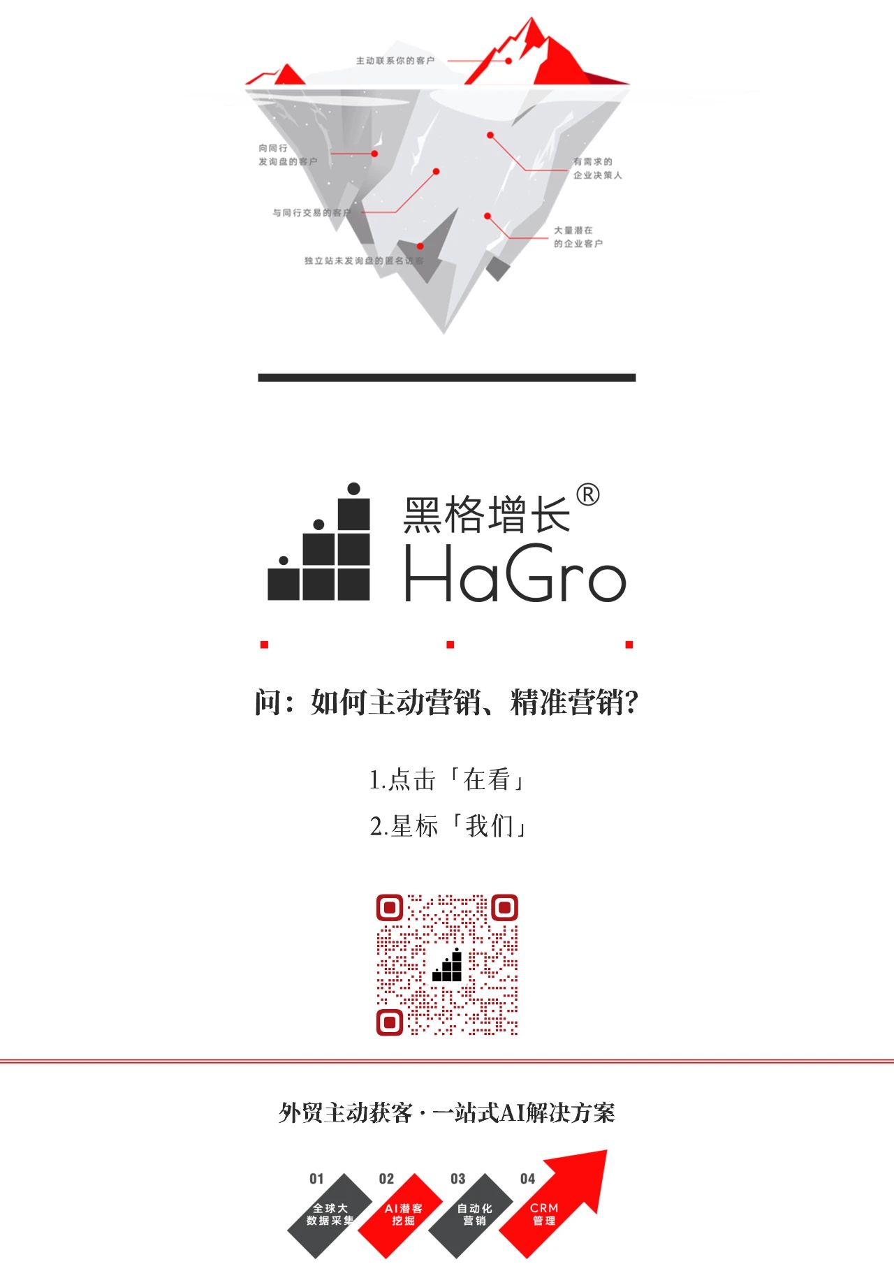 冰山之下的潜在客户需要我们去主动挖掘,精准触达。在了解客户、筛选客户后主动出击,高效完成获客,节约时间成本,才能真正获利。