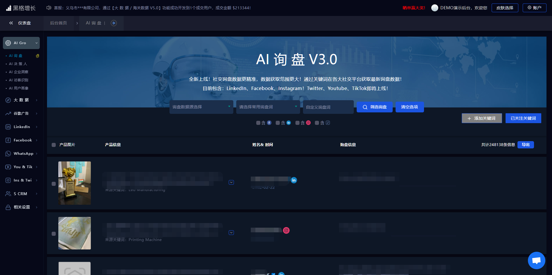 黑格增长AI询盘基于40亿+的海外社媒用户数据体量,包含LinkedIn、Facebook、Instagram、Twitter、YouTube、TikTok等全球知名社媒平台,数据广,来源多,数量有保证,帮助外贸企业抓取社交平台 随时 发布的询盘信息,及时觉察到潜客询盘。