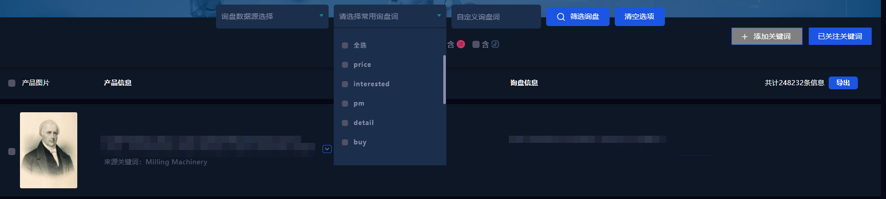 通过产品关键词或精准后缀词展开地毯式搜索,可使用常用询盘词或固定询盘词精准定位行业潜客。