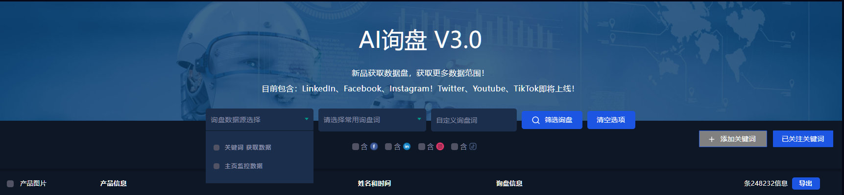 AI询盘以人工智能和大数据技术为保障,实时挖掘询盘信息,低成本,高回报,外贸企业不愁没订单。