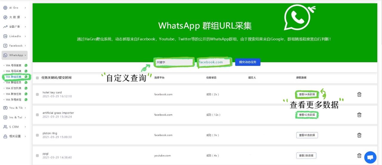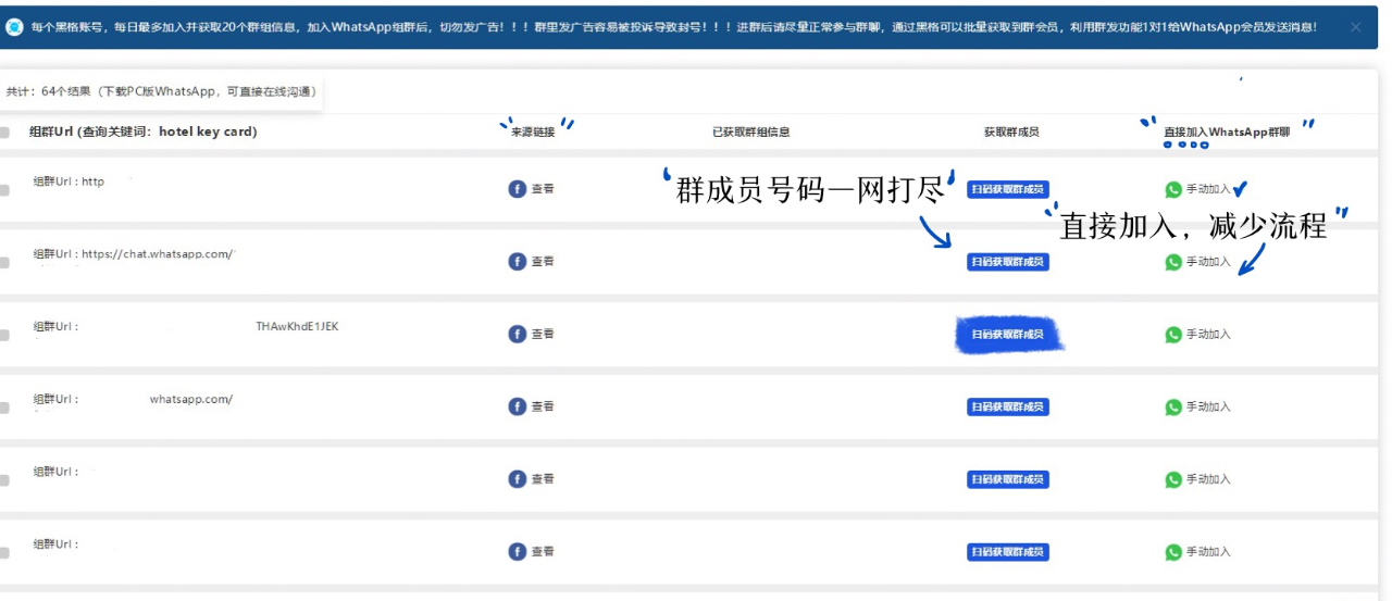 人工力量搜索结果有限不说,而且在各大社媒平台频繁搜索WhatsApp群组,可能会被平台测定为机器行为,对账号运营会有负面影响。
