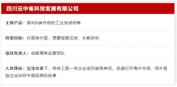 云中雀在近年来迎来了高速发展阶段,但由于工厂地理位置位于三星堆遗址旁,市政规划已经不允许企业进行扩建,加之疫情正面冲击全球旅游业市场,让工业洗涤剂的重要采购商——连锁酒店的采购需求日益下滑。腹背受敌下,这家生产工业洗涤剂的B2B工贸一体企业,决心走向更为广阔的海外市场,开拓全球商机。