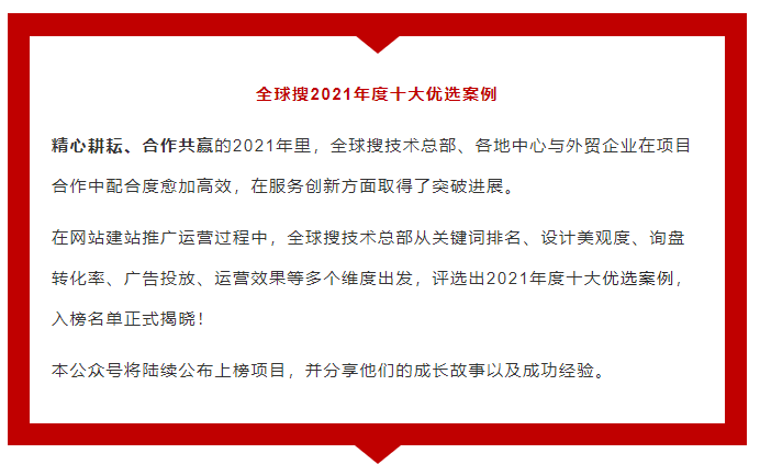 全球搜2021年度运营榜单企业经过层层筛选与评估,最终评选4个企业外贸推广项目入选,这四个项目在运营质量,项目代表性,运营结果方面,值得外贸企业学习。